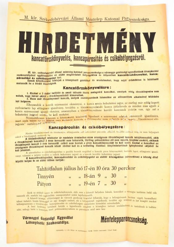 https://www.darabanth.com/en/368-Online-auction/368.0/Art-and-other-collectibles/Printed-Materials~1000032/cca-1920-Hirdetmeny-kancatorzskonyveles-kancaparositas-es-csikobelyegzesrol-42x60-cm-h~II2133141