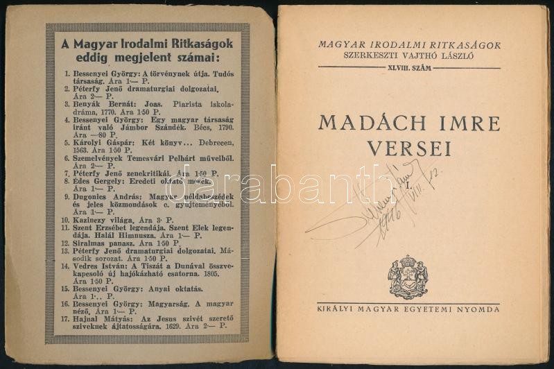 Magyar Irodalmi ritkaságok: Madách Imre versei I. H.n., é.n.., Kir. M.... https://www.darabanth.com/en/368-Online-auction/368.0/Books/Books-Other-rarities~2000020/Magyar-Irodalmi-ritkasagok-Madach-Imre-versei-I-Hn-en-Kir-M-Egyetemi-nyomda-Kiadoi-p~II2135486