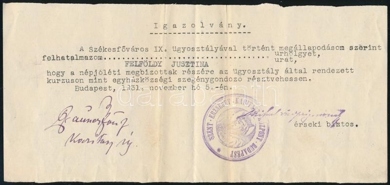 1931 Igazolvány, egyházközségi szegénygondozó népjóléti kurzuson való ...