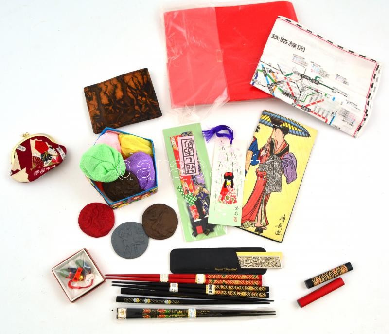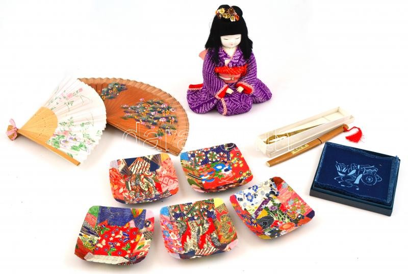 Japán tárgyak vegyes tétel: írószerek, dekoráció, baba, edények.