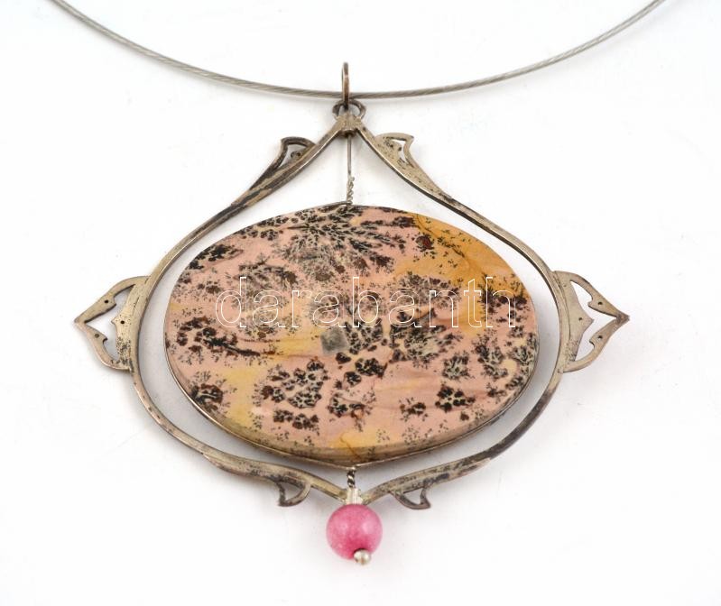 Jáspis medál, ezüst(Ag) kerettel, fém láncon, medál: 7×7 cm