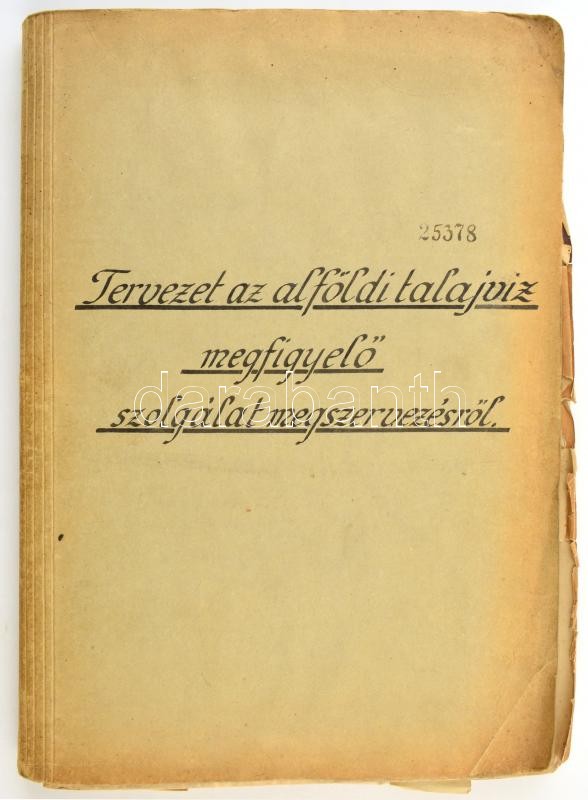 cca 1920-1940 Tervezet az alföldi talajvÃzmegfigyelÅ‘ szolgálat megszervezésérÅ‘l. Benne érdekes, kapcsoldó anyagokkal. Gépelt anyagokkal, grafikonokkal, táblázatokkal, térképekkel, térképvázlatokkal. Feliratozott papÃrmappában.