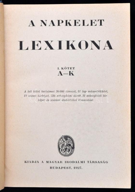 A Napkelet Lexikona I-II. Bp., 1927, Magyar Irodalmi Társaság. Egy kötetben. Két térkép melléklettel. Kiadói aranyozott gerincű egészvászon-kötés, kissé kopottas borÃtóval, de egyébként jó állapotban.