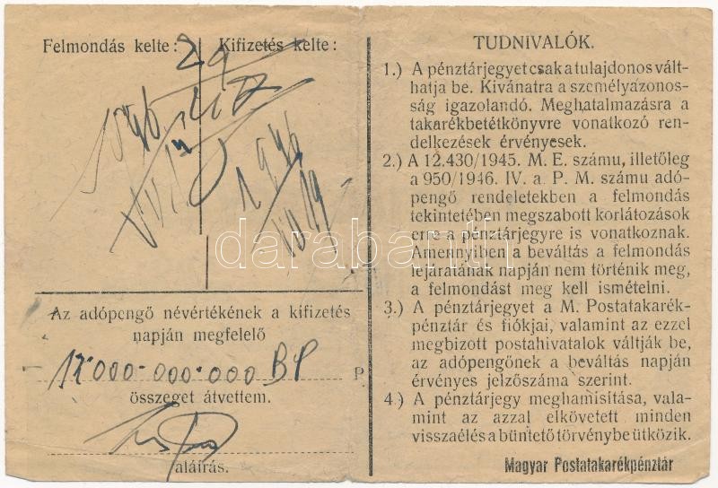 1946. 10.000AP nem kamatozó Pénztárjegy "Másra Át Nem Ruházható" felül...