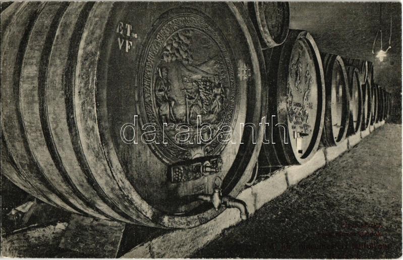 1916 Budapest XXII. Budafok, M. kir. pincemesteri tanfolyam pince részlet, belső, faragványos hordók. Hollenzer és Okos kiadása