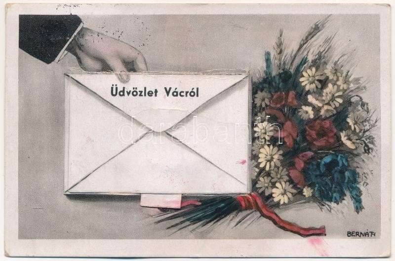 1949 Vác, virágcsokros üdvözlő leporellólap, belül: vasútállomás, fegyintézeti kórház, stb. s: Bernáth + portózott (gyűrődés / crease)