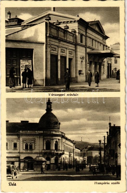 Dés, Dej; Vármegyei színház, Uránia mozi, Hotel Hungaria szálloda, automobil, üzletek / theatre, cinema, hotel, automobile, shops