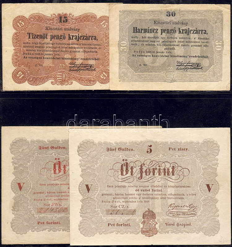 1848. "Kossuth-bankók" 15Kr, 30Kr, 5Ft (2x) klf színben, 10Ft (2x) kül...