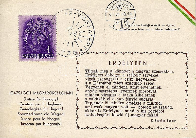 Irredenta verses lap "Érsekújvár viszzatért" alkalmi bélyegzéssel