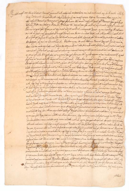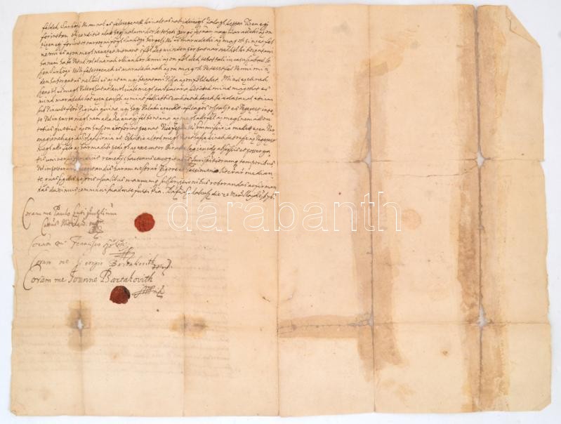 1676 Vagyonfelosztási szerződés Csergő István és Csergő Éva nyitrai lakosok között. Magyar nyelven, viaszpecsétekkel. Ragasztott