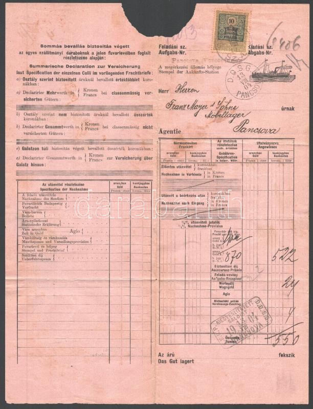 1904 DDSG hajóraklevél "PANCSOVA"