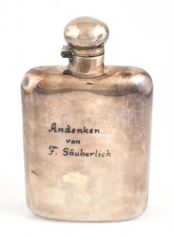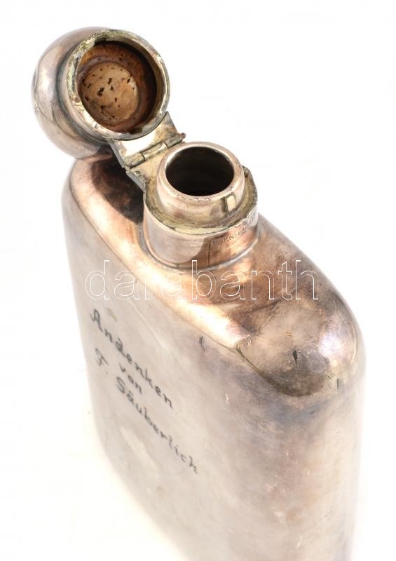 Ezüstözött, feliratozott fém italos palack, kulcs nélkül, jelzett, kis...