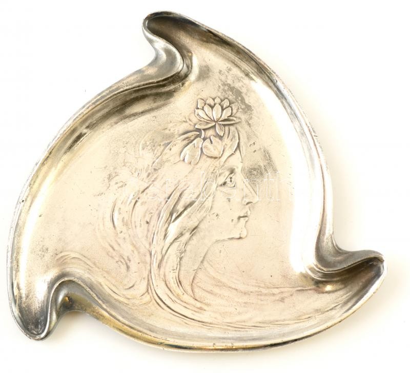 Szecessziós női fejes tálka, fém, jelzés nélkül, 12,5×13 cm