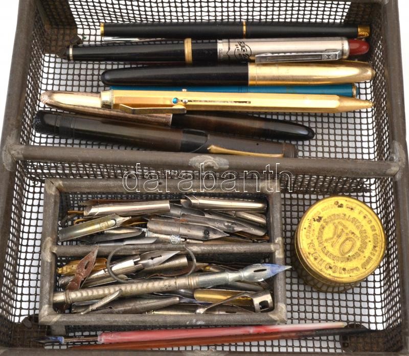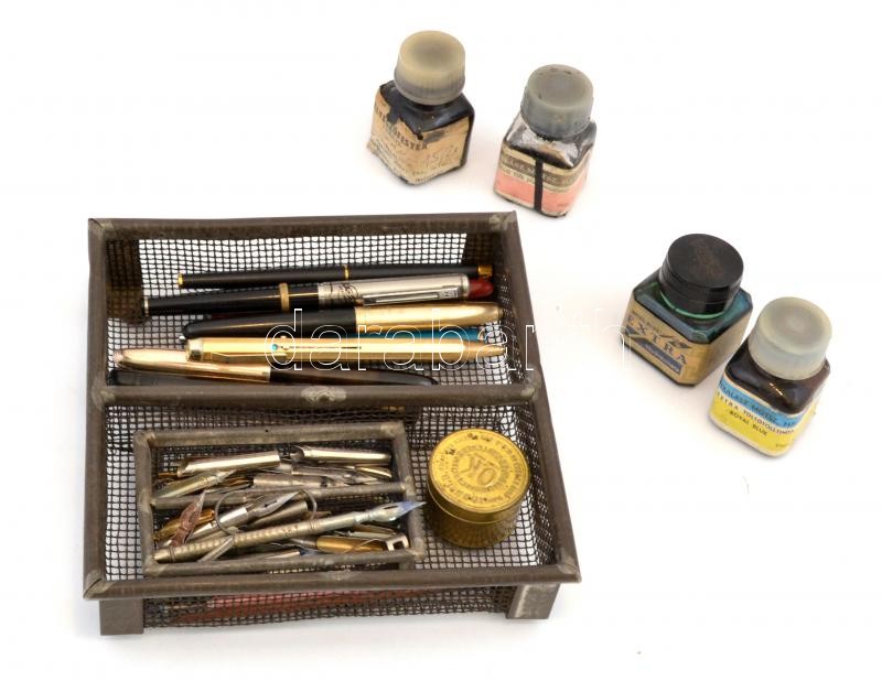 Vegyes régi és régebbi írószer tétel: 4 db tintásüveg, 1950-60 körül (3 db Aranykalász MGTSZ felirattal), kopott, hiányos címkékkel. Amerikai, papírok összetűzéséhez használatos, 1910-30 körül, eredeti fém dobozában. Töltőtollak, golyóstollak, tollszárak, tollhegyek stb.