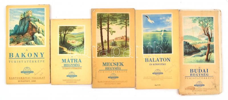 Description: 1957-1966 5 db Kartográfia turista térkép, Budai-hegység, Balaton és környéke, Mecsek-hegység, Mátra-hegység, Bakony turista térképe, különféle méretben, változó állapotban.