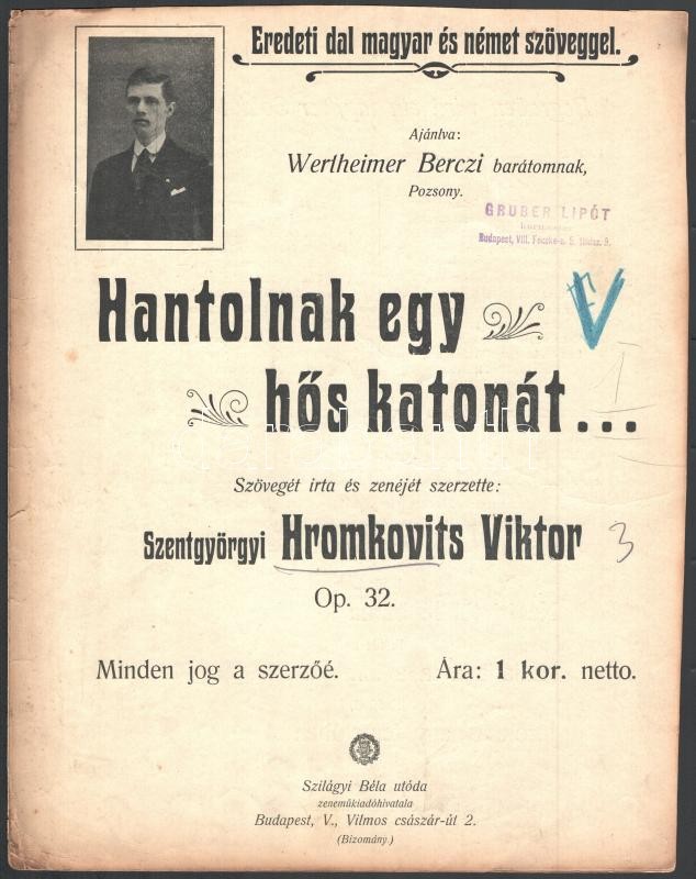cca 1910 Hantolnak egy hős katonát.Szövegét írta és zenéjét szerzette: Szentgyörgyi Hromkovits Viktor. É.n., Bp., Szilágyi Béla utóda zeneműkiadóhivatala. Kotta. 2p. Gruber Lipót karmester tulajdonosi bélyegzőjével. Foltos, kissé szakadt