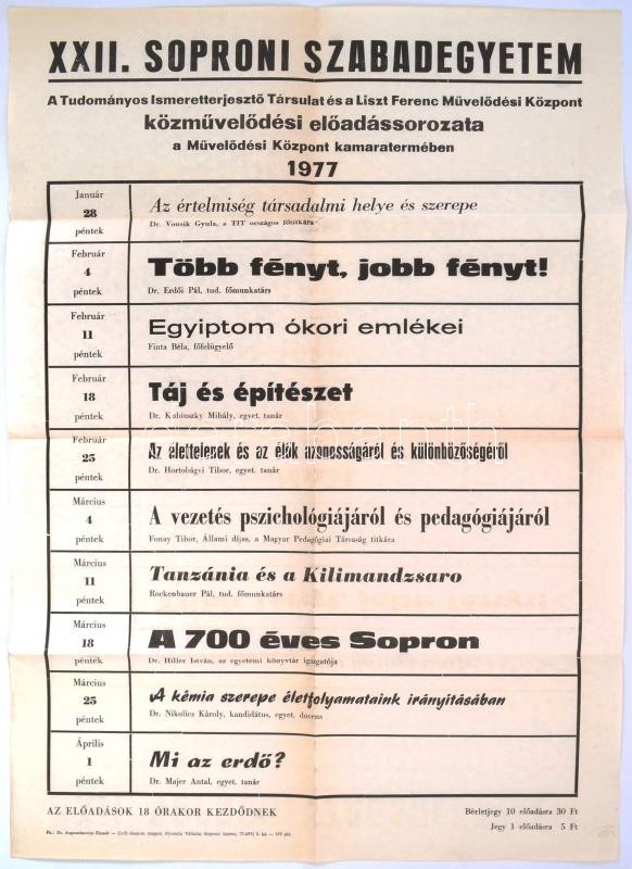 1977 XXII. Soproni Szabadegyetem előadásainak plakátja, Sopron, Győr-Sopron megyei Nyomda Vállalat, megjelent 200 példányban, hajtásnyomokkal, 58x41 cm.