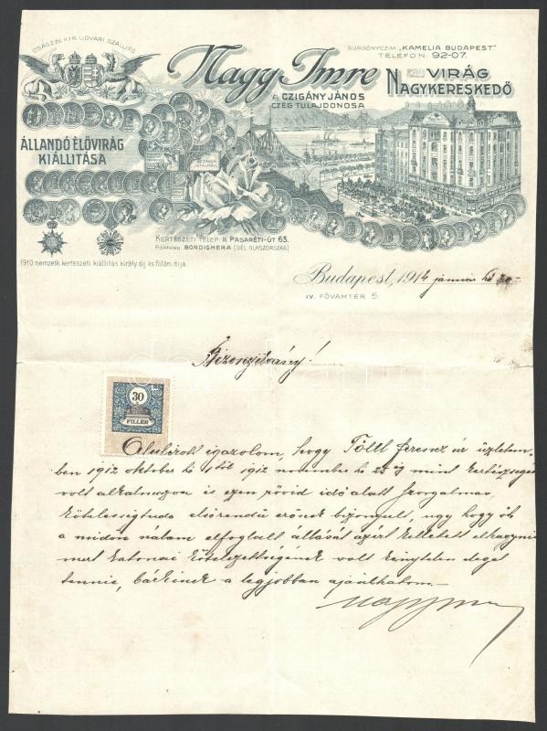 1914 Nagy Imre virág nagykereskedő díszes fejélces számla