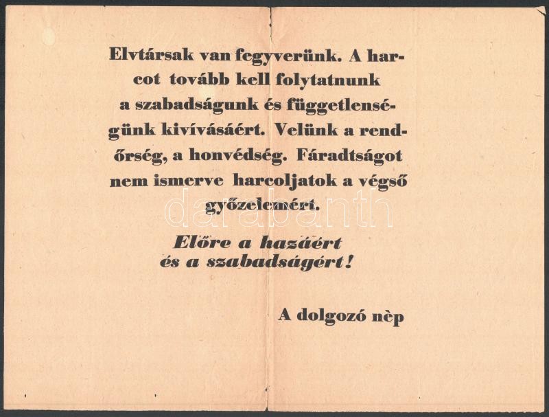 Description: 1956 "Elvtársak van fegyverünk. A harcot tovább kell folytatnunk a szabadságunk és függetlenségünk kivívásáért. Velünk a rendőrség, a honvédség. Fáradtságot nem ismerve harcoljatok a végső győzelemért. Előre a hazáért és a szabadságért! A dolgozó nép.", röplap, szakadt, 22x30 cm
