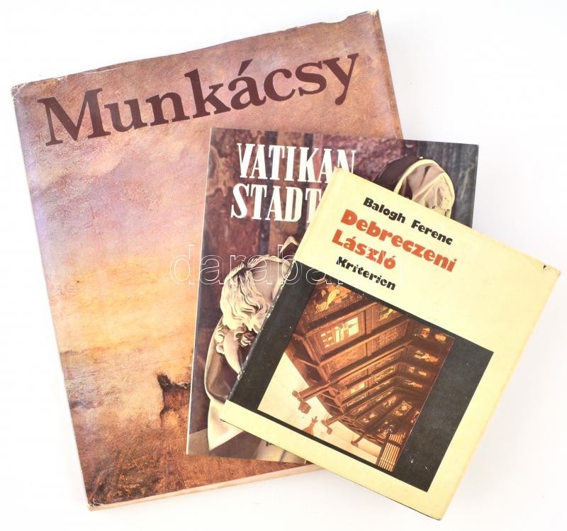 3 db művészeti könyv. Balogh Ferenc: Debreczeni László, Bukarest, 1983, Kriterion, kartonált vászonkötés, kiadó, enyhén szakadt papír védőborítóval. Loretta Santini: Vatikan Stadt, Narni, T5erni, 1980, színes fotókkal illusztrált, kiadói ragasztott papírkötés. Székely András: Munkácsy, Budapest, 1987, Corvina, 2. kiadás, vászonkötés, kiadói papírborítóval, foltos és enyhén dohos.