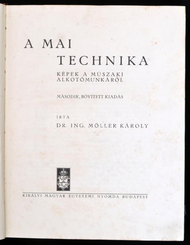 Möller Károly: A mai technika. Képek a műszaki alkotómunkáról. Bp.,(1940),Kir. M. Egyetemi Nyomda. Második, bővített kiadás. Szövegközti és egészoldalas illusztrációkkal. Kiadói félbőr-kötésben, kopott borítóval és gerinccel
