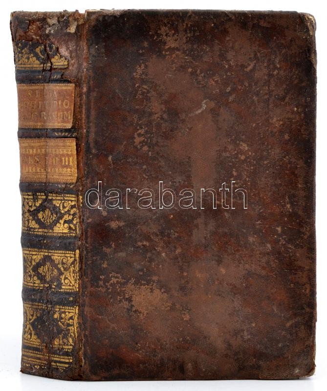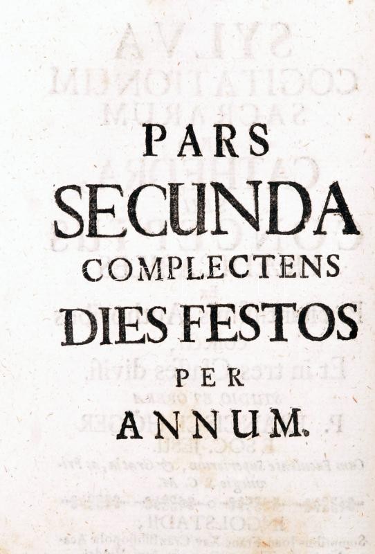 Franz Höger: Sylva Cogitationum Sacrarum Pro Cathedra Seu Conceptus Praedicabiles Ex Praestantissimis Authoribus Collecti. Et In tres Classes divisi. Pars Prima Complectens Dominicas per Annum.; Pars Secunda Complectens Dies Festos per Annum. [Ingolstadt-Augsburg] Ingolstadii-Aug. Vindel., 1749., Sumptibus Joan. Franc. Xav. Cräz Bibliopolae Academici et Thomae Summer, [Johann Franz Xaver Krätz-Thomas Summer], 8 sztl. lev. +307 p. + 2 sztl. lev.+323+3 p. Latin nyelven. Csak Pars Prima, és Pars Secunda. Korabeli egészbőr-kötésben, kopott borítóval, az elülső előzéklap hiányzik, az elülső szennylap szakadt.