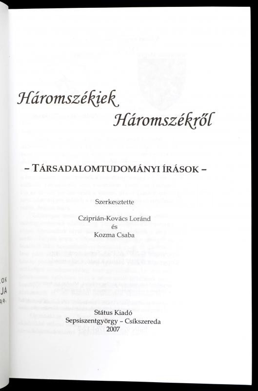 Cziprián Kovács Loránd - Kozma Csaba (szerk.): Háromszékiek Háromszékről. Társadalomtudományi írások. Sepsiszentgyörgy-Csíkszereda, 2007, Státus kiadó. Kiadói papírkötés.