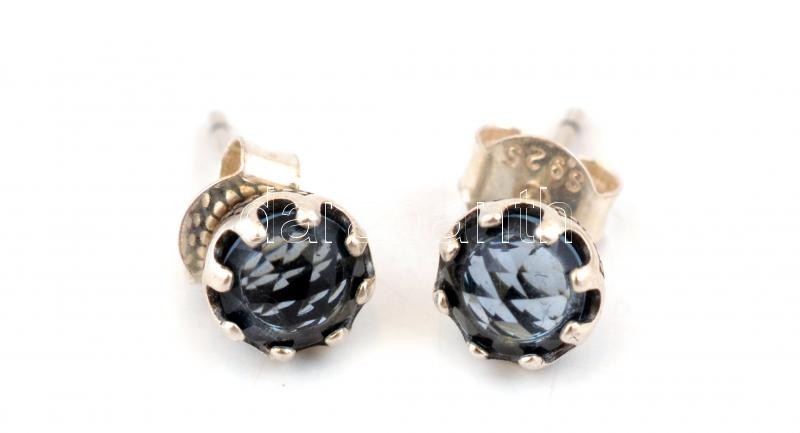 Ezüst(Ag) fülbevalópár, szürke kővel, Pandora jelzéssel, d: 0,5 cm, bruttó: 1 g
