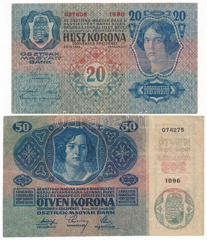 https://www.darabanth.com/en/370-Online-auction/370.0/Numismatics/Hungarian-Banknotes~2000007/1913-20K-plus-1914-50K-mindketton-DEUTSCHOSTERREICH-felulbelyegzes-TIII-Adamo-K17M-K24M~II2153688