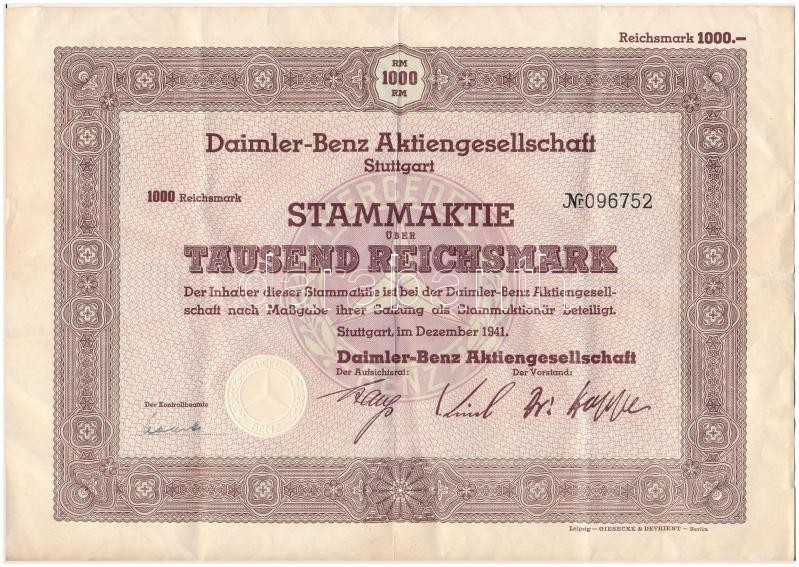German Third Empire / Stuttgart 1941. "Mercedes Daimler-Benz" share about 1000 Reichsmark, with embossed stamp C:F cutting