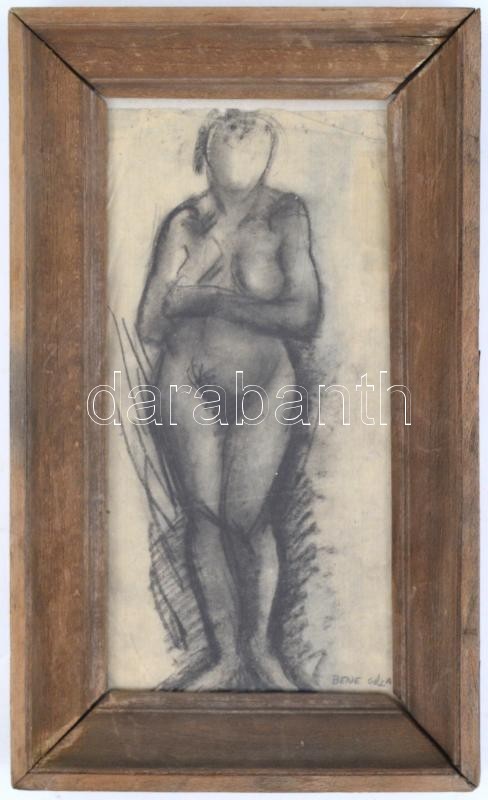 Bene jelzéssel: Álló női akt. Szén, papír. Üvegezett fa keretben, 30×1...
