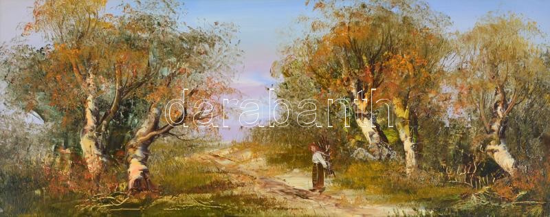 Bocsák Krisztina (1964- ): Hazafelé. Olaj, farost, jelzett, díszes fa keretben, hátoldalán címkével, 20×50 cm