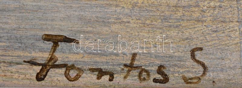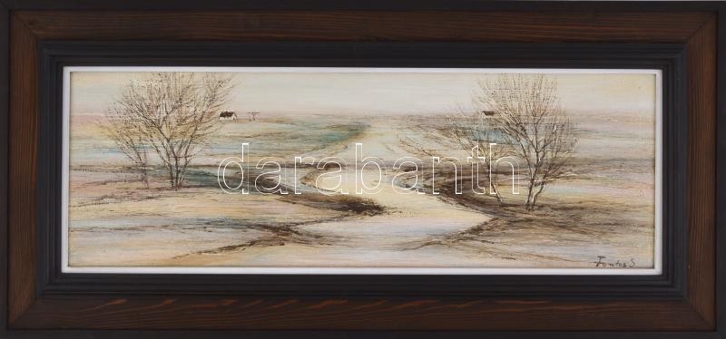 Fontos Sándor (1920-1991): Üllési határ (Szeged közelében). Vegyes technika, farost, jelzett, hátoldalán a autográf felirattal, fa keretben, 25×70 cm