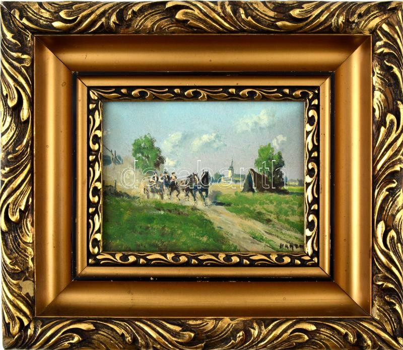 Hárencz János (1899-1969): Szekéren. Olaj, farost, jelzett, fa keretben, 13×16 cm