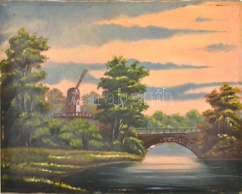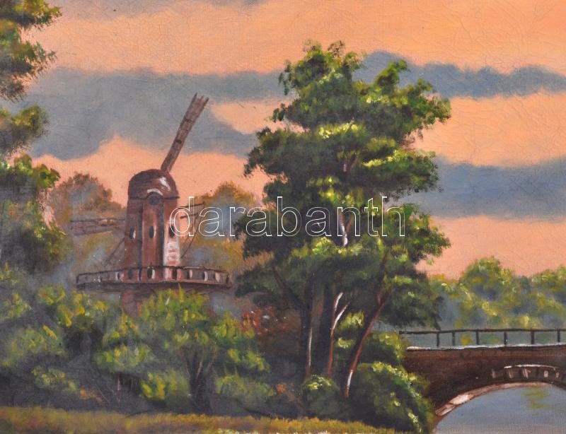 Jelzés nélkül: Folyóparti alkonyat szélmalommal. Olaj, vászon, 55×69 c...