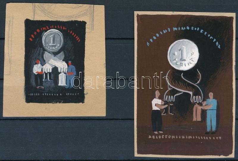 Konecsni György (1908-1970): Forint tervek, 2 db. Tempera, papír, hátoldalon pecséttel jelzett, 4,5×3 és 7,5×5 cm