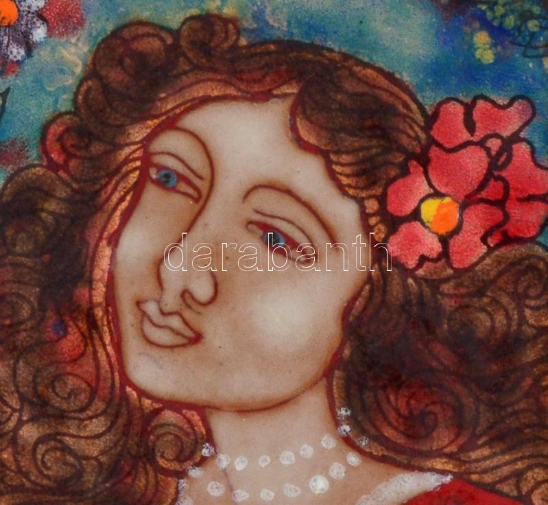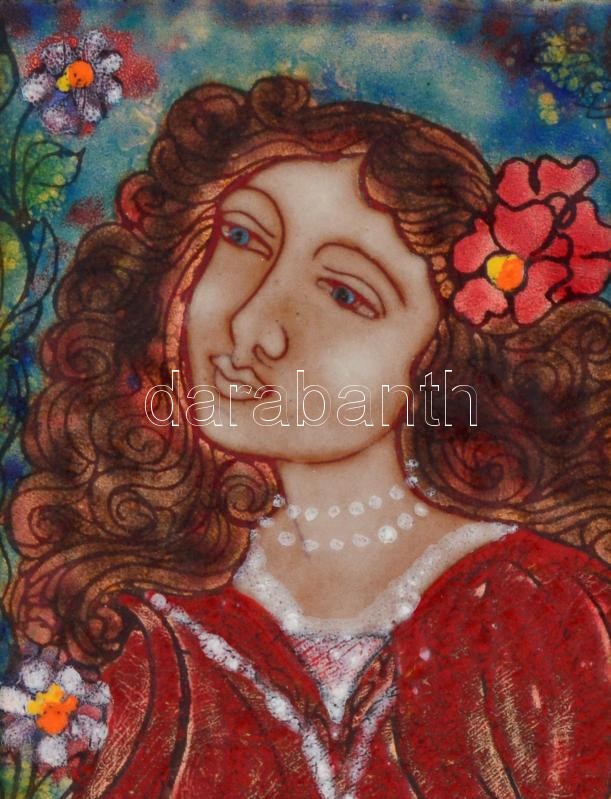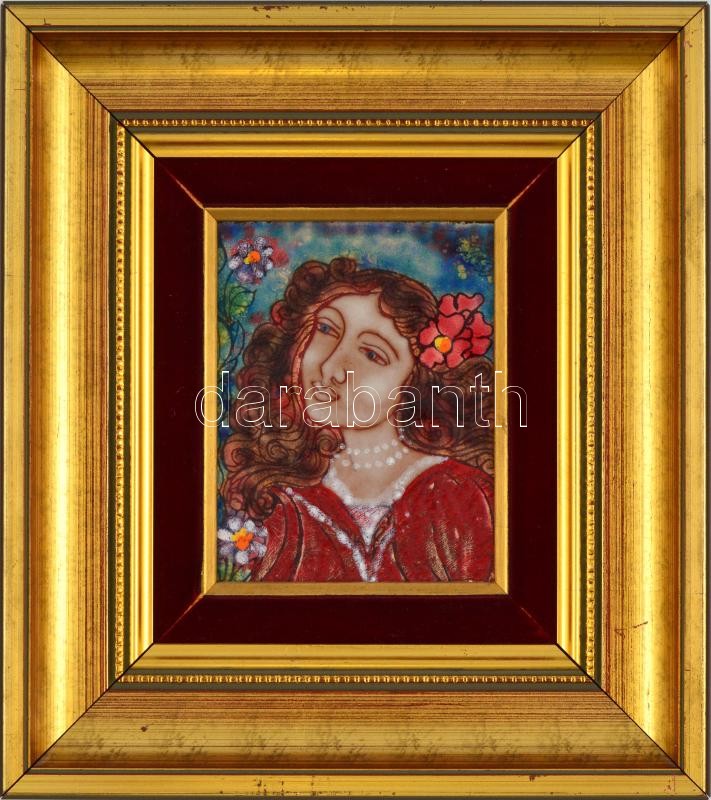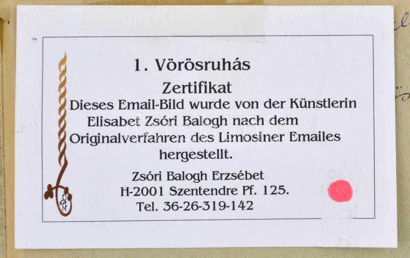KÅ‘vágóné Zsóri Balogh Erzsébet (1955-): Leányka vörösruhában. Tűzzománc, jelzett, hátoldalán feliratozott és német nyelvű tanúsÃtvánnyal, dÃszes, enyhén kopott fa keretben, 12,5×9,5 cm