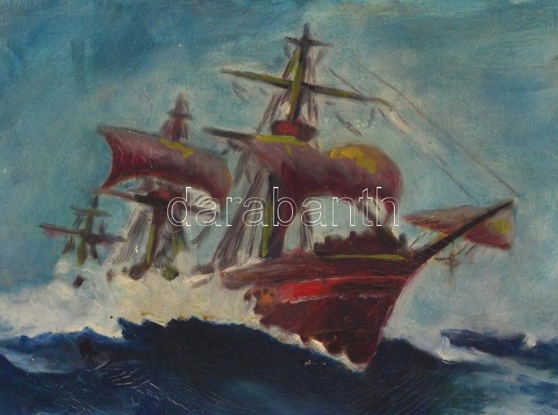 Marossy Gábor (?-?): Vitorláshajó háborgó tengeren. Olaj, vászon, sérü...