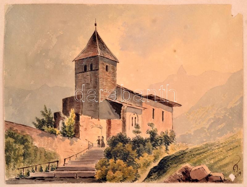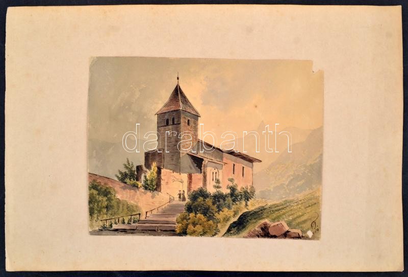 Olvashatatlan jelzéssel: Hegyvidéki templom. Akvarell, papír, sérült, hiányos, papírra kasírozva, datált (859), 18,5×25 cm