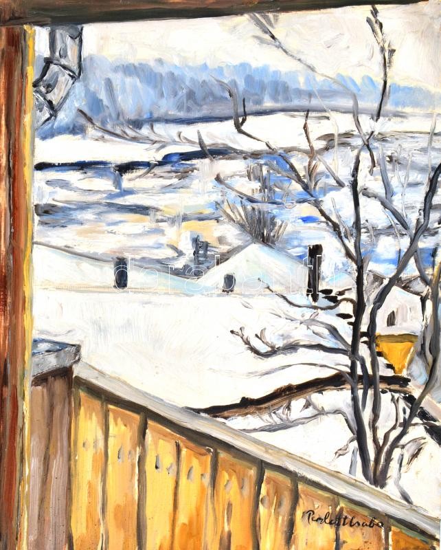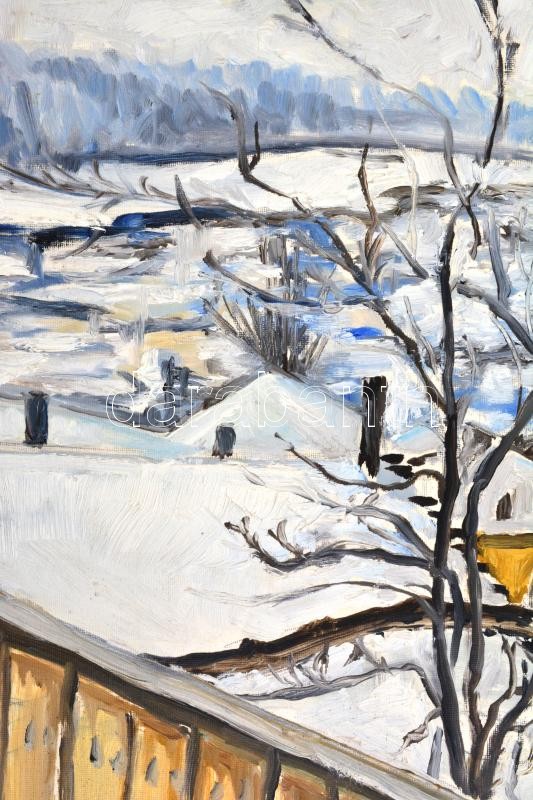 Perlrott jelzéssel: Téli táj. Olaj, papír, jobb felső sarkában törésny...