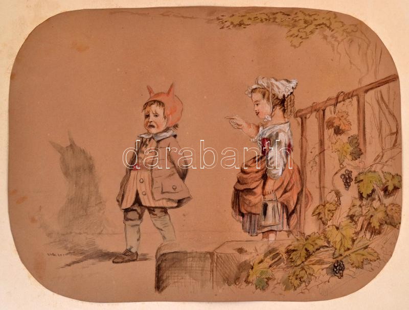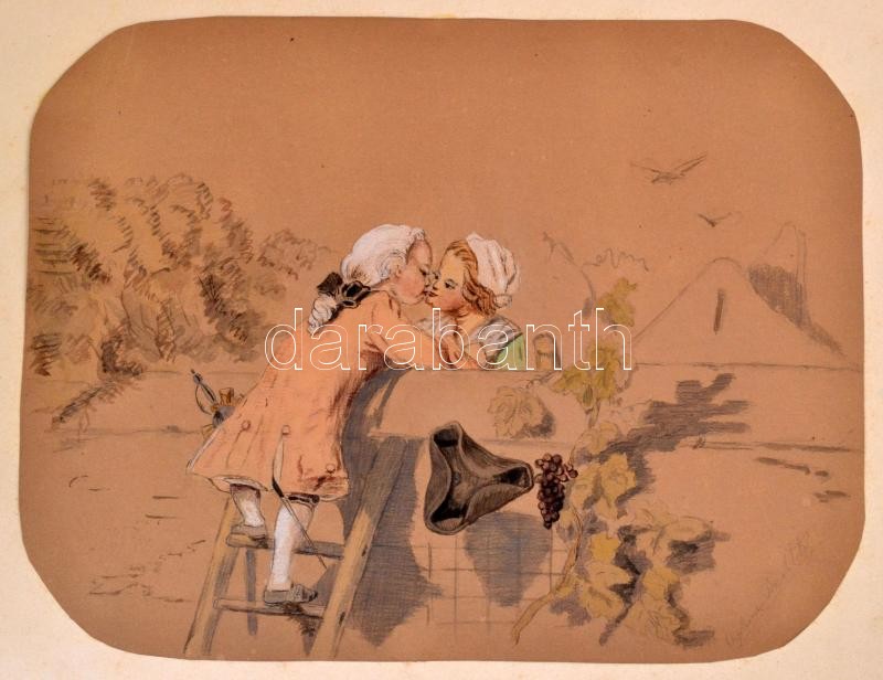 Sophine Berchtold jelzéssel, 2 db mű, feltehetően a XIX sz. második feléből: Szerelmesek és Incselkedők. Ceruza, akvarell, papír, kasírozva, 16x21 cm