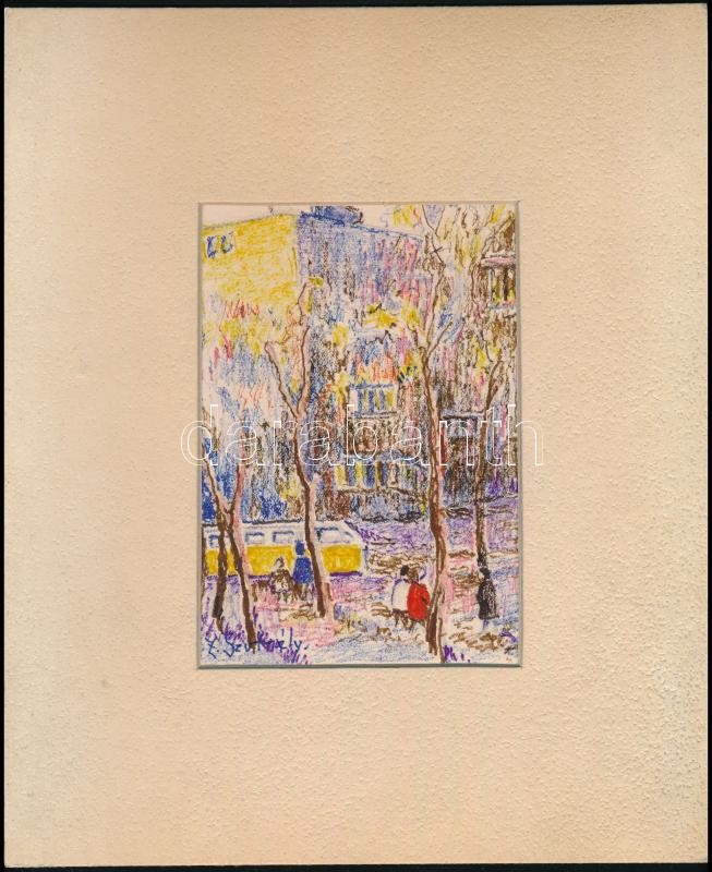 Z. Szutrély (?) jelzéssel: A nagyváros színei. Filctoll, színes ceruza, papír, paszpartuban, 14x9,5 cm