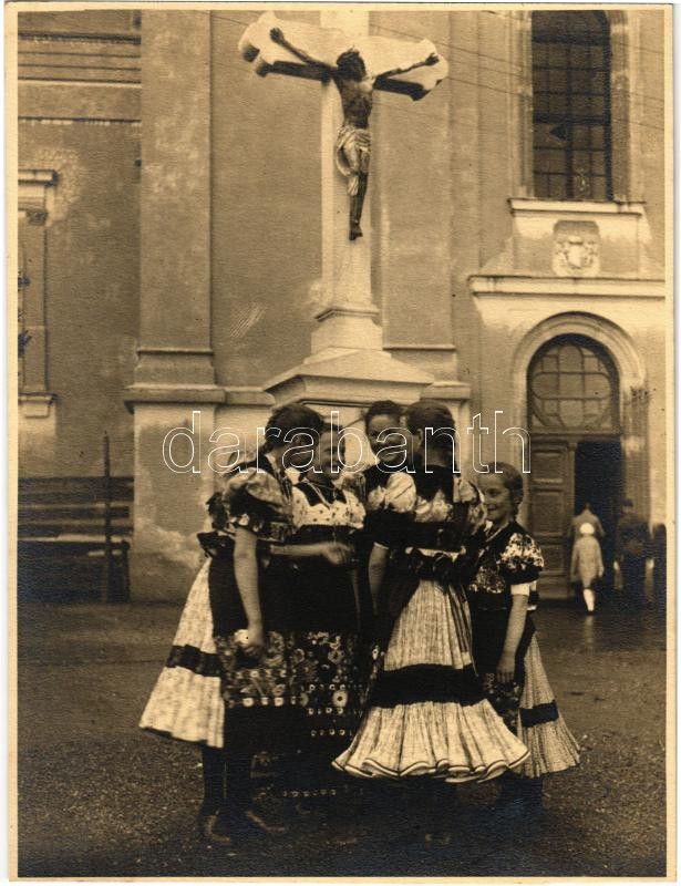 cca 1929 Budapest, Kerny István (1879-1963) budapesti fotóművész hagyatékából jelzés nélküli vintage fotó (Népviseletbe öltözött lányok), 23x17,5 cm
