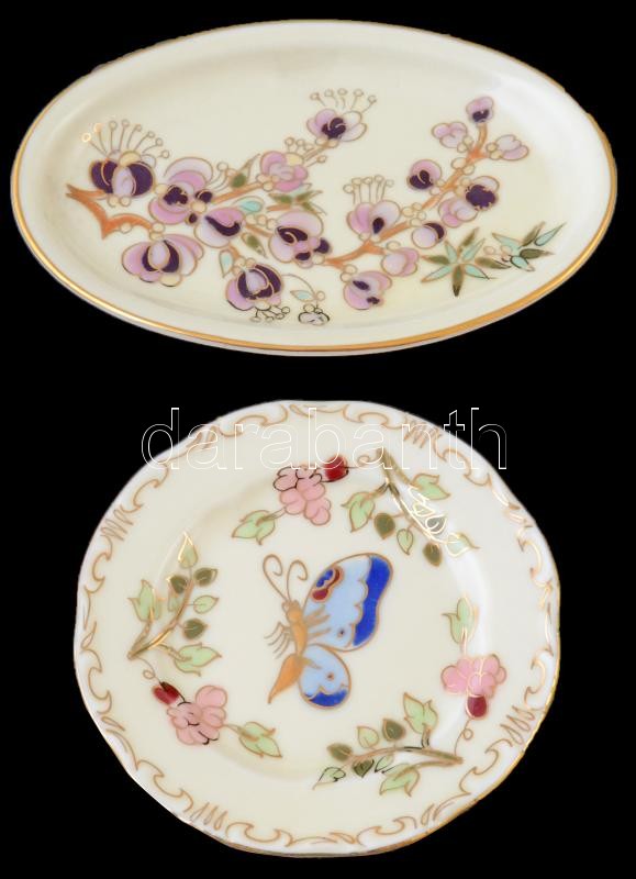 Zsolnay búzavirág és pillangó mintás tálka. Kézzel festett, jelzett, hibátlan. 11x7 cm, 8 cm