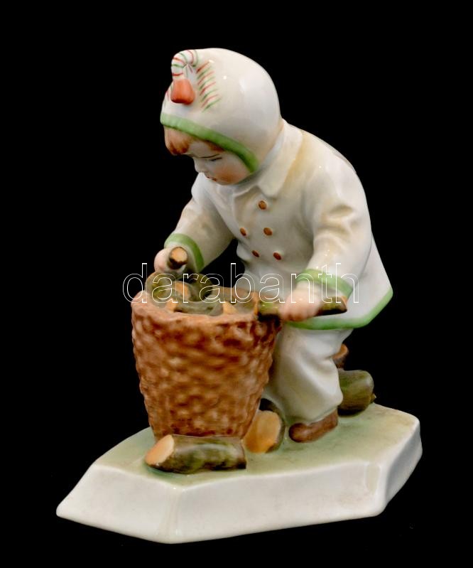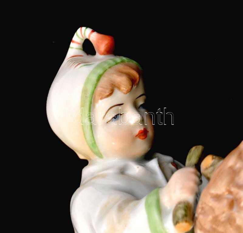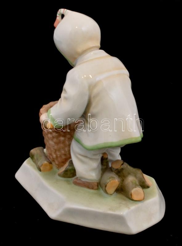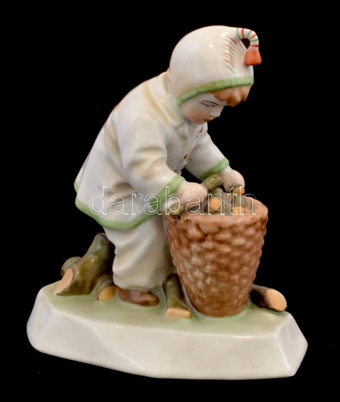 Zsolnay faágakat gyűjtő kisfiú, kézzel festett, jelzett, hibátlan, m:15,5 cm