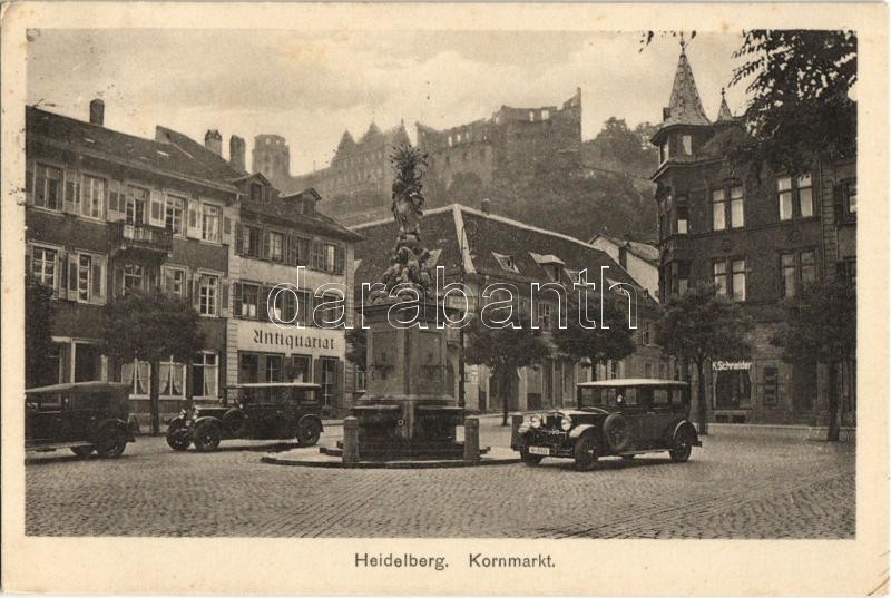 1930 Heidelberg, Kornmarkt, Antiquariat / square, automobiles, shop of K. Schneider (EK)