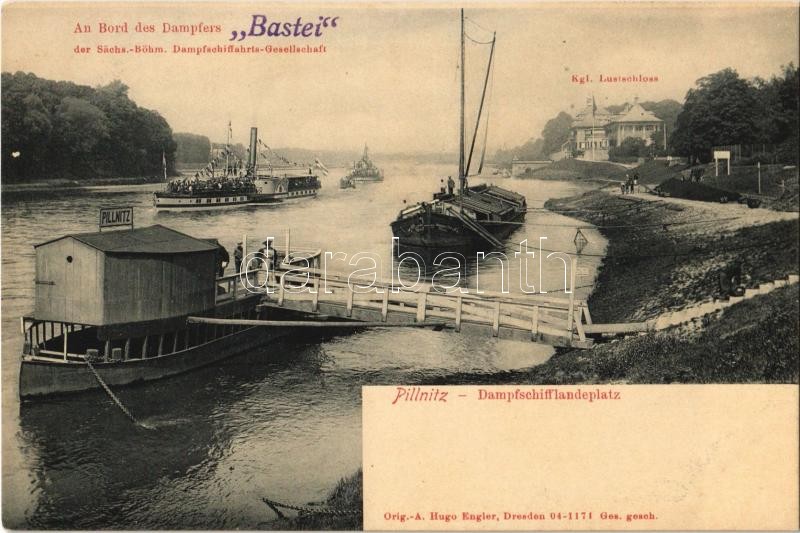 Description: Dresden, Pillnitz, Dampfschifflandeplatz, Kgl. Lustschloss. An Bord des Dampfers "Bastei" der Sächs.-Böhm. Dampfschiffahrts-Gesellschaft / steamship station, castle. Orig.-A. Hugo Engler