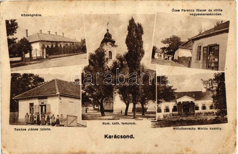 Description: 1928 Karácsond (Gyöngyös), községháza, Római katolikus templom, Mátyásovszky Miklós kastélya, Takács János üzlete, Őzse Ferenc fűszer és rőfös vegyeskereskedése (Rb)