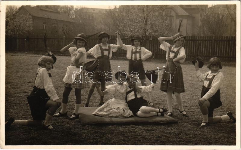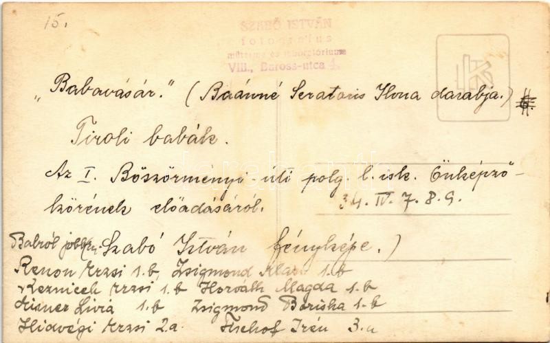 Description: 1934 Budapest XII. Böszörményi úti polgári leányiskola önképző körének "Babavásár" c. előadása az udvaron, Tiroli babák. Szabó István fényképe, photo (fl)