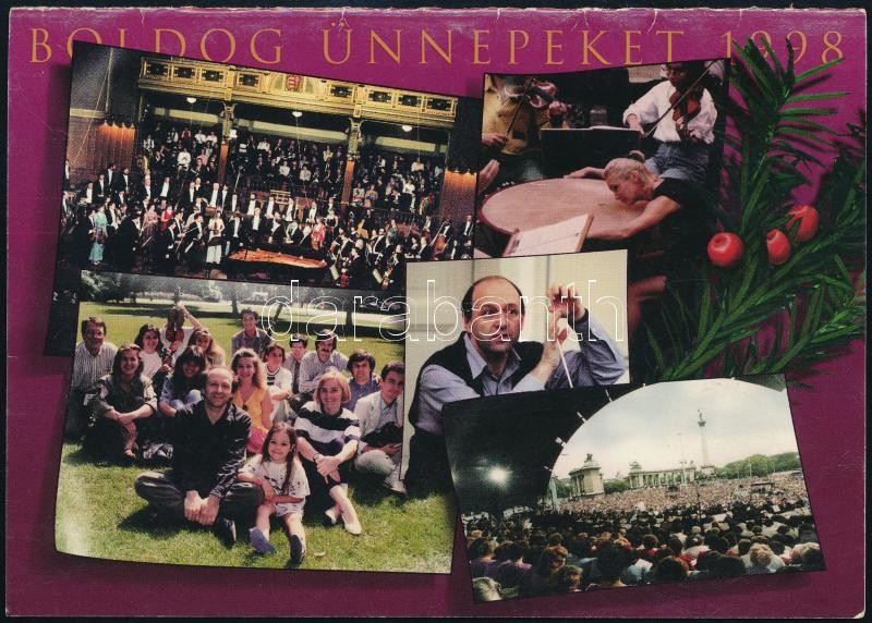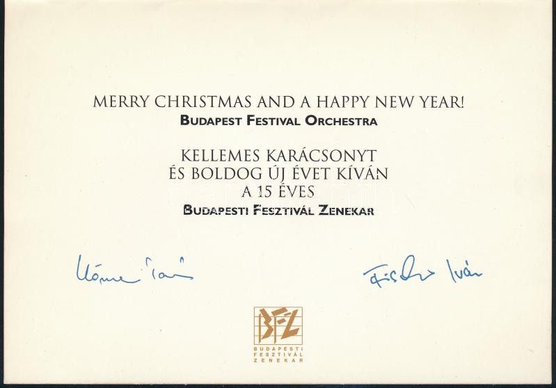 Fischer Iván (1951-) karmester, a Budapesti Fesztiválzenekar zeneigazgatójának aláÃrása a Budapesti Fesztiválzenekar 1998-as karácsonyi és újévi üdvözlÅ‘lapján, mellette Körner Tamásé, a BFZ akkori ügyvezetÅ‘ igazgatójának aláÃrása